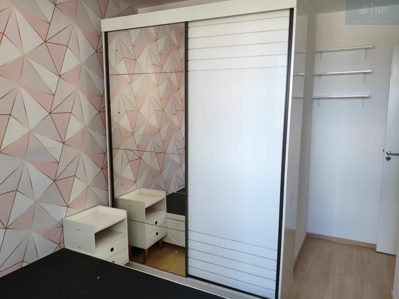 * Segundo dormitório com cômoda e mini prateleiras.