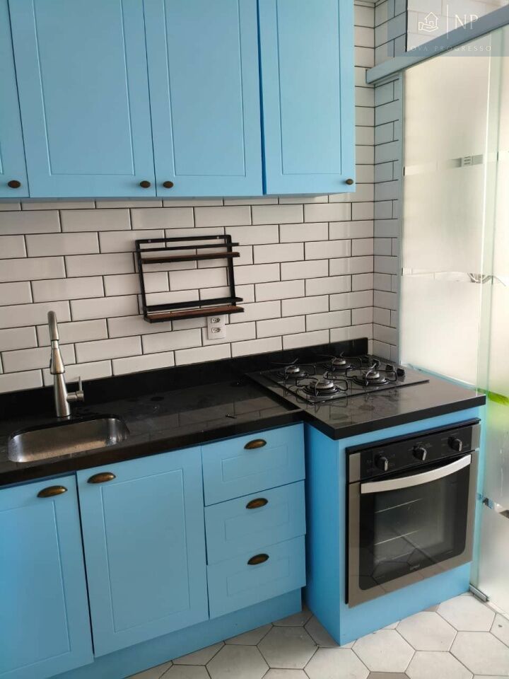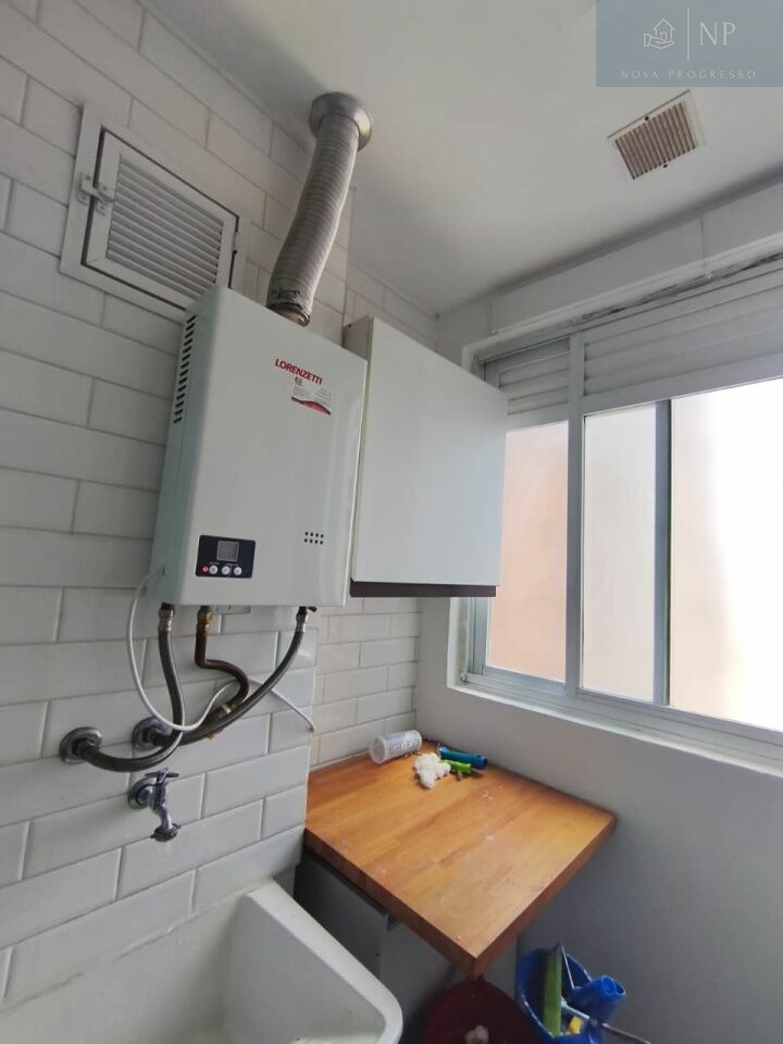 A área de serviço possui aquecedor a gás digital, tanque com armário, armário aéreo e tábua de passar roupa retrátil.