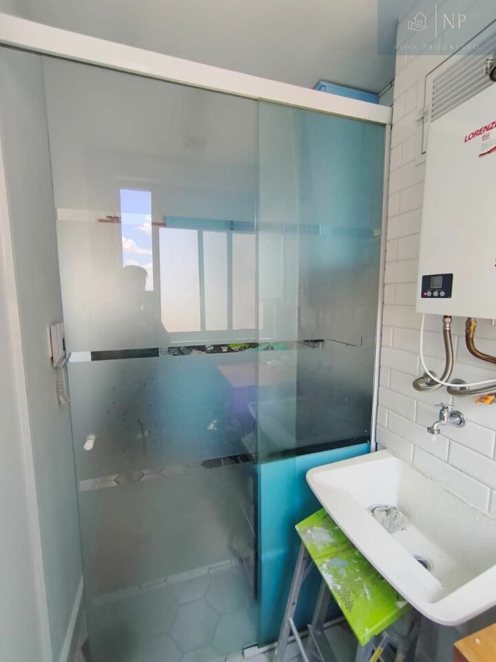 O banheiro conta com box de vidro, armário com espelheira, chuveiro a gás e gabinete.
