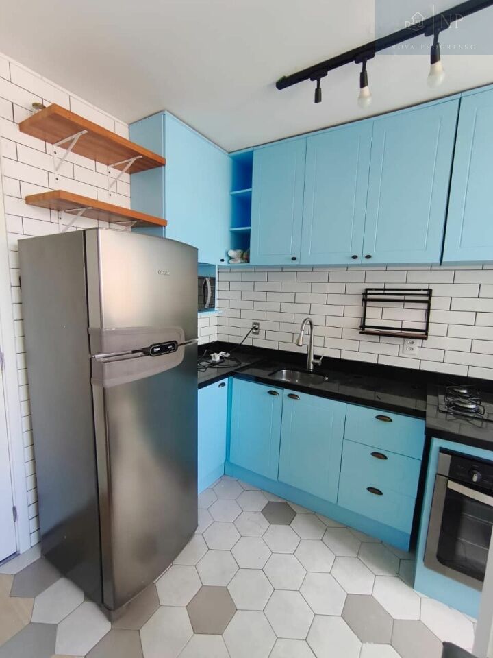 A cozinha é completa, com armários aéreos, gabinete, balcão de canto, micro-ondas, geladeira, cooktop e forno elétrico embutido, bancada em mármore e porta de vidro de correr que separa a cozinha da área de serviço.